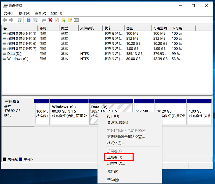 2. 在弹出的“磁盘管理”对话框中,可以看到磁盘的分区情况。鼠标右键点击您需要进行分区的磁盘,选择“压缩卷”,系统会自动的查询压缩空间。