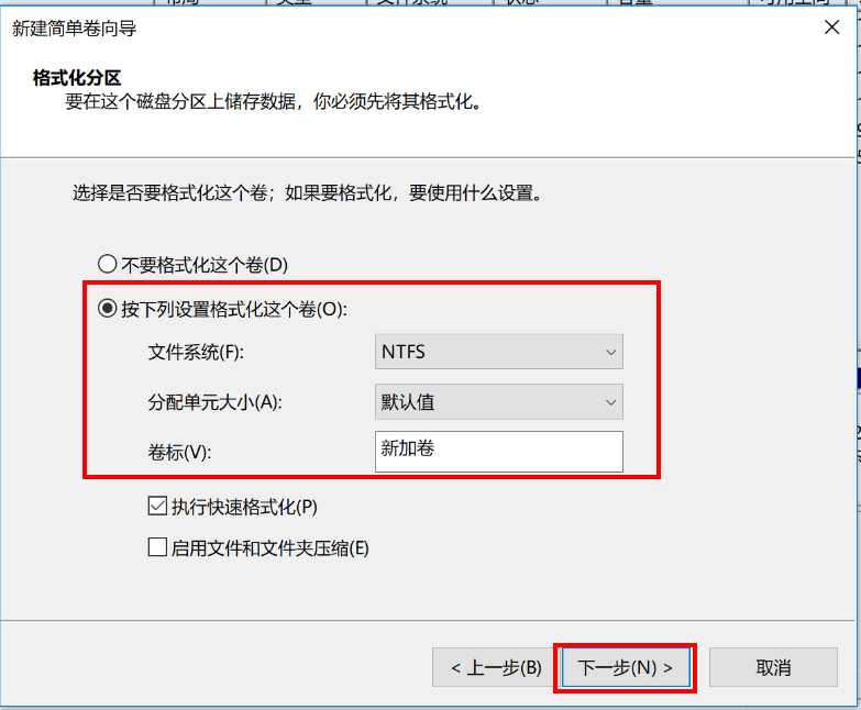 8. 为新建的简单卷选择磁盘的格式,一般选择“NTFS”,点击“下一步”。