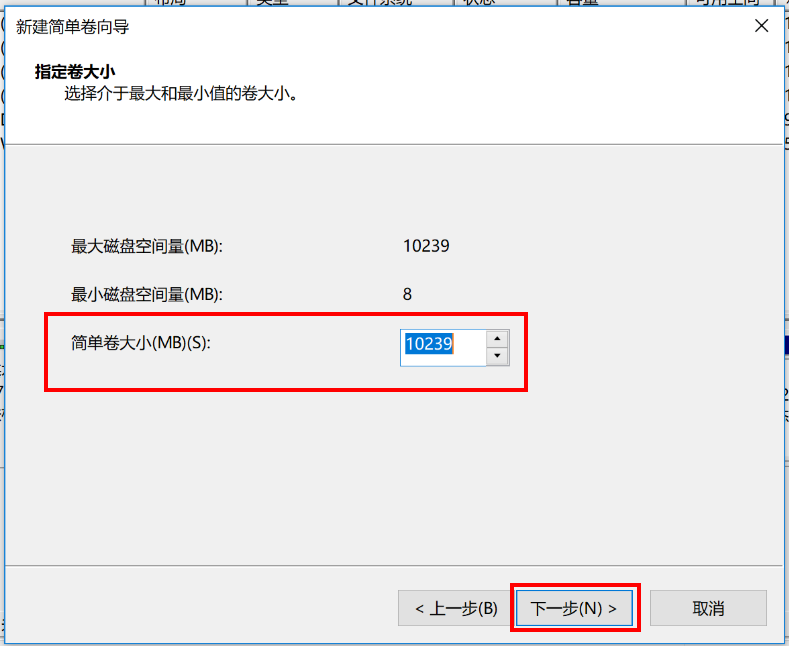 6. 指定卷的大小,点击“下一步”。
