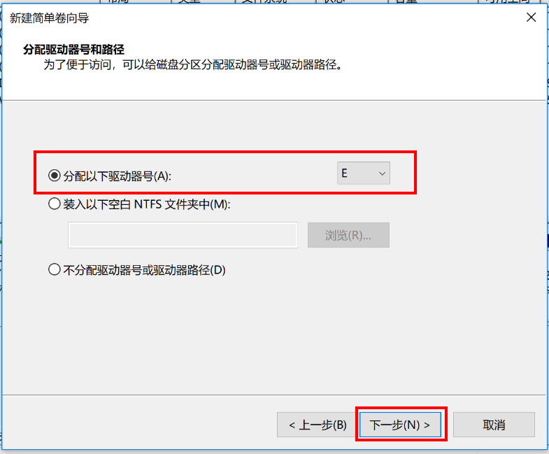 7. 在“分配以下驱动器号”右边的下拉列表中,为您新建的简单卷选择盘符,点击“下一步”。