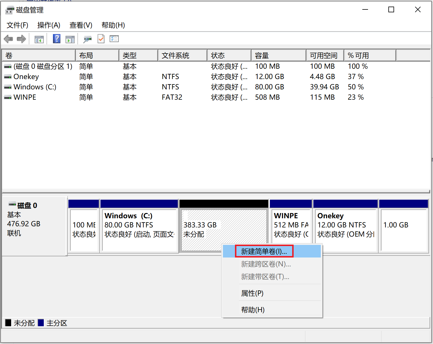 4. 选中该空白分区,鼠标右击,选择“新建简单卷”。