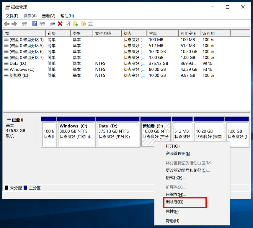 1. 鼠标右击要删除的磁盘,点击“删除卷”。