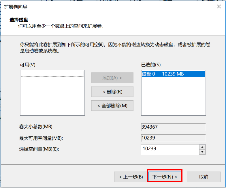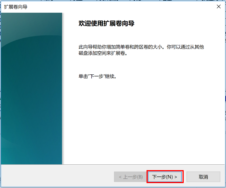 3. 在弹出的“扩展卷向导”对话框中,点击“下一步”。