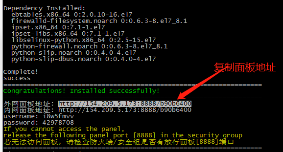 稍等片刻,出现面板地址及账号密码即表示安装完成,